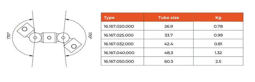 Double Swivel Combinations are versatile fittings applicable to a range of installations, such as railings, roof edge protection, etc. Swivels can deviate up to roughly 85 degrees each in both directions from horizontal position. Our combinations consist of 3 parts – 1 x double male swivel fitting and 2 x female swivel fittings, all easily assembled via the included grub screws. If needed, items can also be supplied separately.