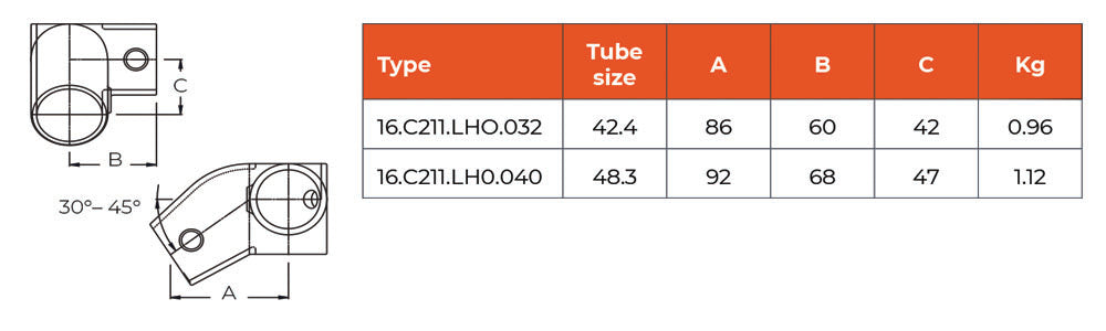 Adjustable between the angles of 30° and 45°, this Left hand outlet tee is applied when mid rail height changes from flat level, to slope accommodating staircases or ramps. This C211LH.C211 fitting is easily assembled with the aid of a ratchet or Allen keys. Available in both left and right angles.
